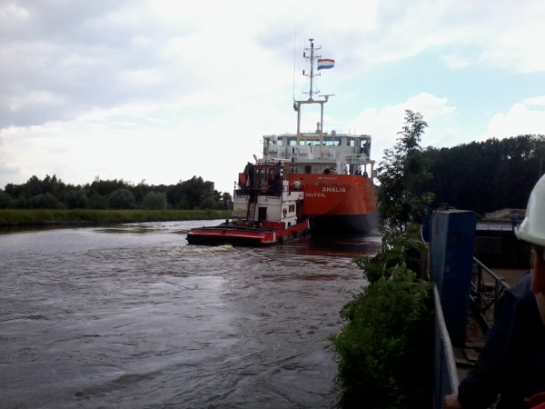 Het schip gaat, met behulp van een duw- en sleepboot, van Waterhuizen naar Delfzijl