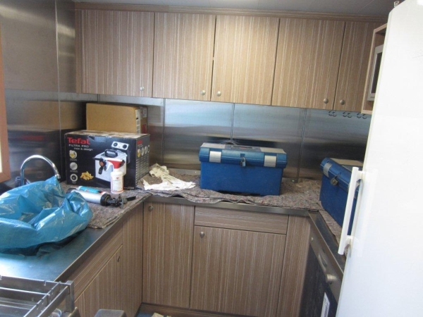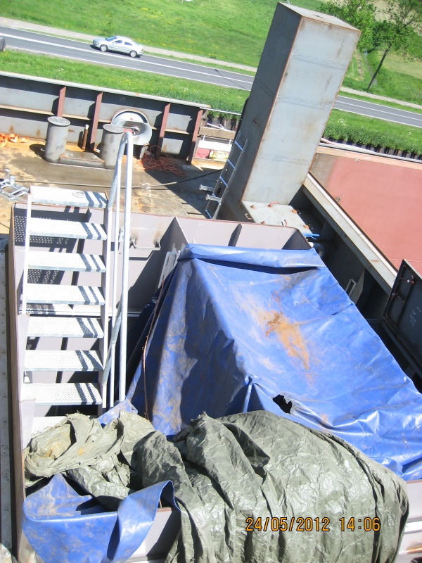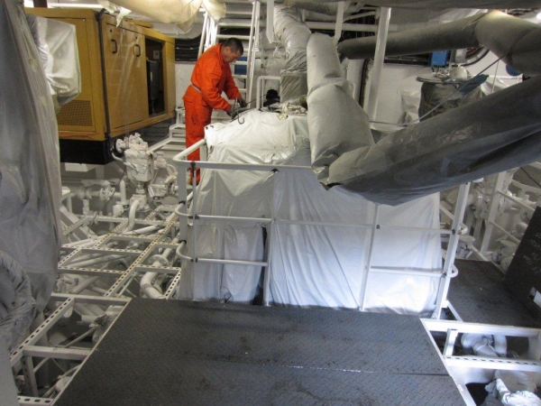 De motor e.d. in de machinekamer afgedekt i.v.m. verfspuiten