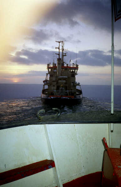 De Holland kon alleen niet meer door het ijs komen op het Zweedse Vänermeer, vandaar de hulp van deze ijsbreker. Februari 1999.