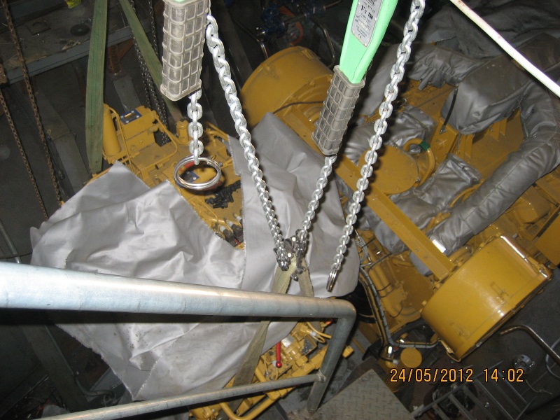 De keerkoppeling hangt in de takels achter de Caterpillar hoofdmotor.